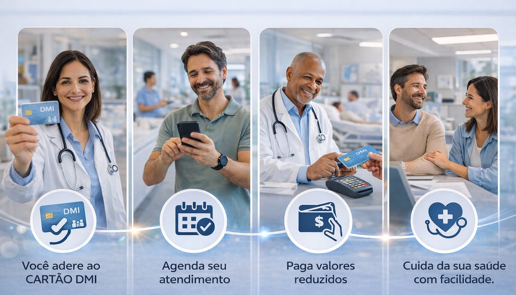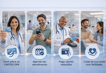 Com o CARTÃO DMI, cuidar da sua saúde é simples e rápido: você faz a adesão, agenda seu atendimento, paga valores reduzidos e tem acesso a consultas, exames e serviços com facilidade sempre que precisar.